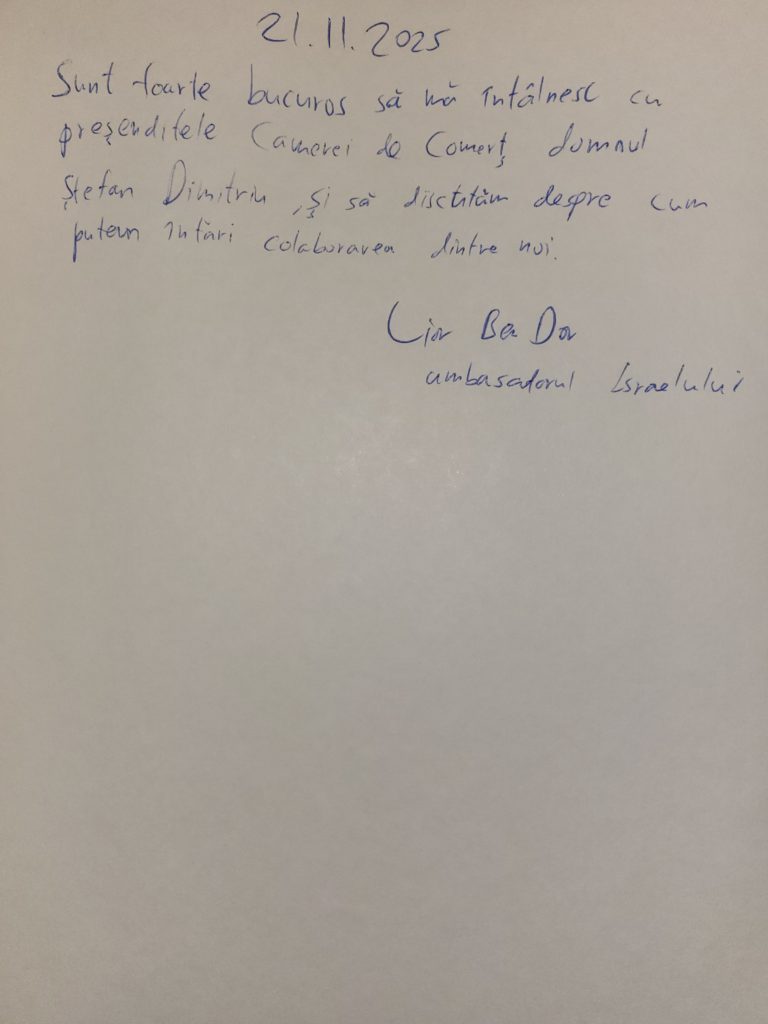La finalul vizitei, Excelența Sa Dr. Lior Ben Dor, Ambasador Extraordinar și Plenipotențiar al Statului Israel a semnat în Cartea de Onoare a Camerei de Comert si Industrie Cluj.