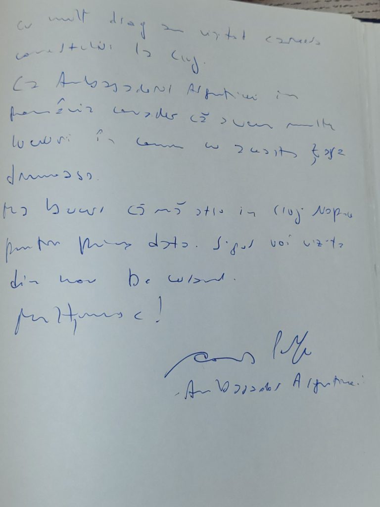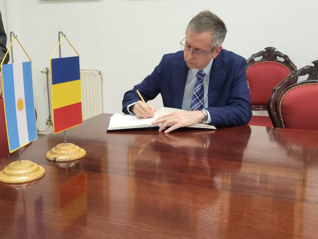 La finalul vizitei, Excelența Sa, domnul Carlos Alejandro Poffo, Ambasador Extraordinar şi Plenipotenţiar al Republicii Argentina în România a semnat în Cartea de Onoare a Camerei de Comert si Industrie Cluj.