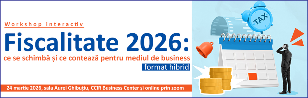 workshop-ul interactiv „Fiscalitate 2026: ce se schimbă și ce contează pentru mediul de business”, care va avea loc în data de 24 martie 2026, începând cu ora 10.00, în format hibrid, la sala Aurel Ghibuțiu, sediul CCIR Business Center și online prin platforma zoom.
